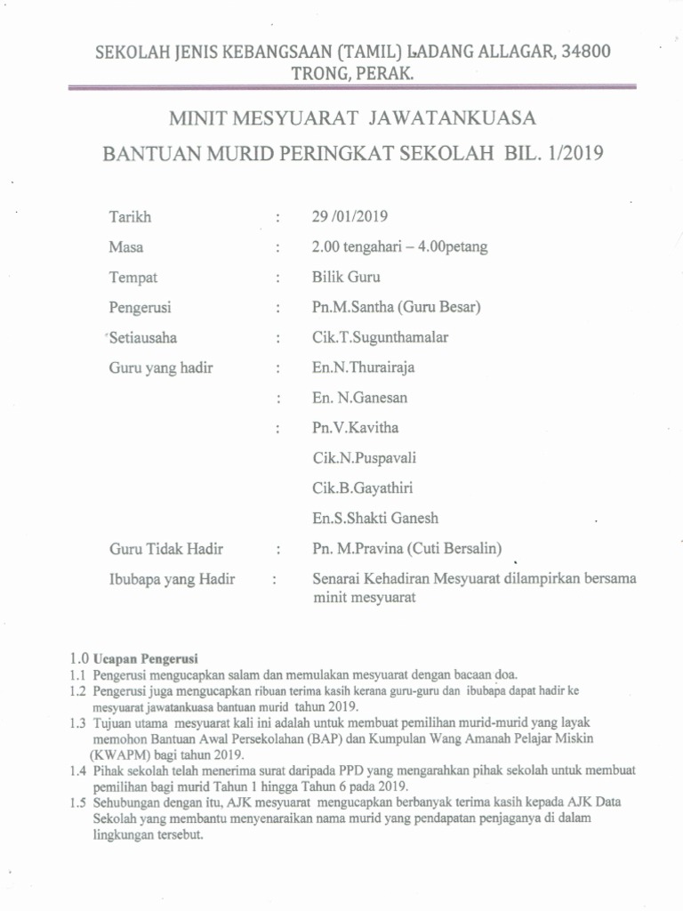 Minit Mesyuarat Pengurusan Bantuan Sekolah Bil 1 2019